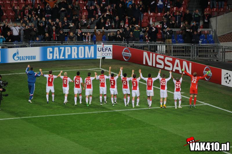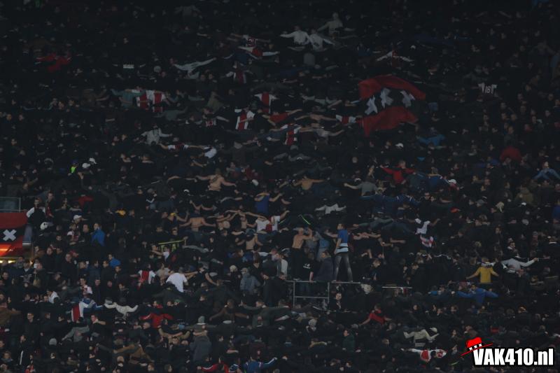We beginnen kwa sfeer goed. ‘Geen dag’ start keihard en vervolgens zitten er ook diverse uitschieters tussen. Later zakt het wat in, mede misschien ook doordat het op veld nog niet echt lukt. Vlak voor rust is het toch raak. De tweede helft knalt het vak dan ook nog harder, wetende dat Ajax met deze steun de voorsprong nog verder kan uitbouwen. En dat gebeurd. Met uitstekend voetbal is de stand na zo’n 50 minuten spelen 3-0 en barst er een massaal feest los. Diverse songs galmen door de Arena en na de 4-0 gaat het volume alleen maar verder omhoog tot het einde van de wedstrijd.
