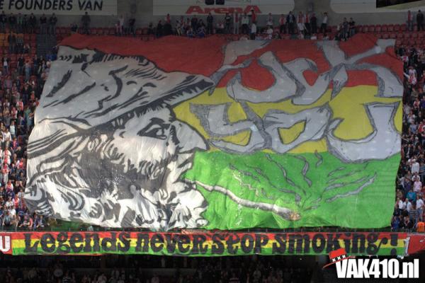 Wij, Ajax, zijn gewend altijd en overal te domineren. Tijden zijn veranderd. Waar er vroeger na 15 minuten slecht spel al “Sesamstraat lalala” te horen was lijkt mede dankzij de inbreng van VAK 410 het besef te leven dat Ajax het support van de tribunes meer dan ooit nodig heeft. Meer en meer Ajacieden gaan bijna kritiekloos achter de ploeg staan. In de sportief mindere tijden lijken veel Ajacieden hun ei kwijt te kunnen in het nummer van Bob Marley. Met een cynische toon of met hoop dat altijd zal blijven. Wat moet je ook anders als die-hard fan. Na zware jaren breekt een bijzondere periode aan in onze clubgeschiedenis. Onder leiding van Johan Cruijff wordt de fluwelen revolutie ingezet en is onze Frank, Frankie de Boer, trainer van Ajax 1. De jeugd heeft weer de toekomst en Ajacieden van naam zitten weer in alle gelederen van de club. Twee jaar achter elkaar worden we kampioen. Had die wijze man met die drie vogeltjes op zijn stoep toch gelijk.